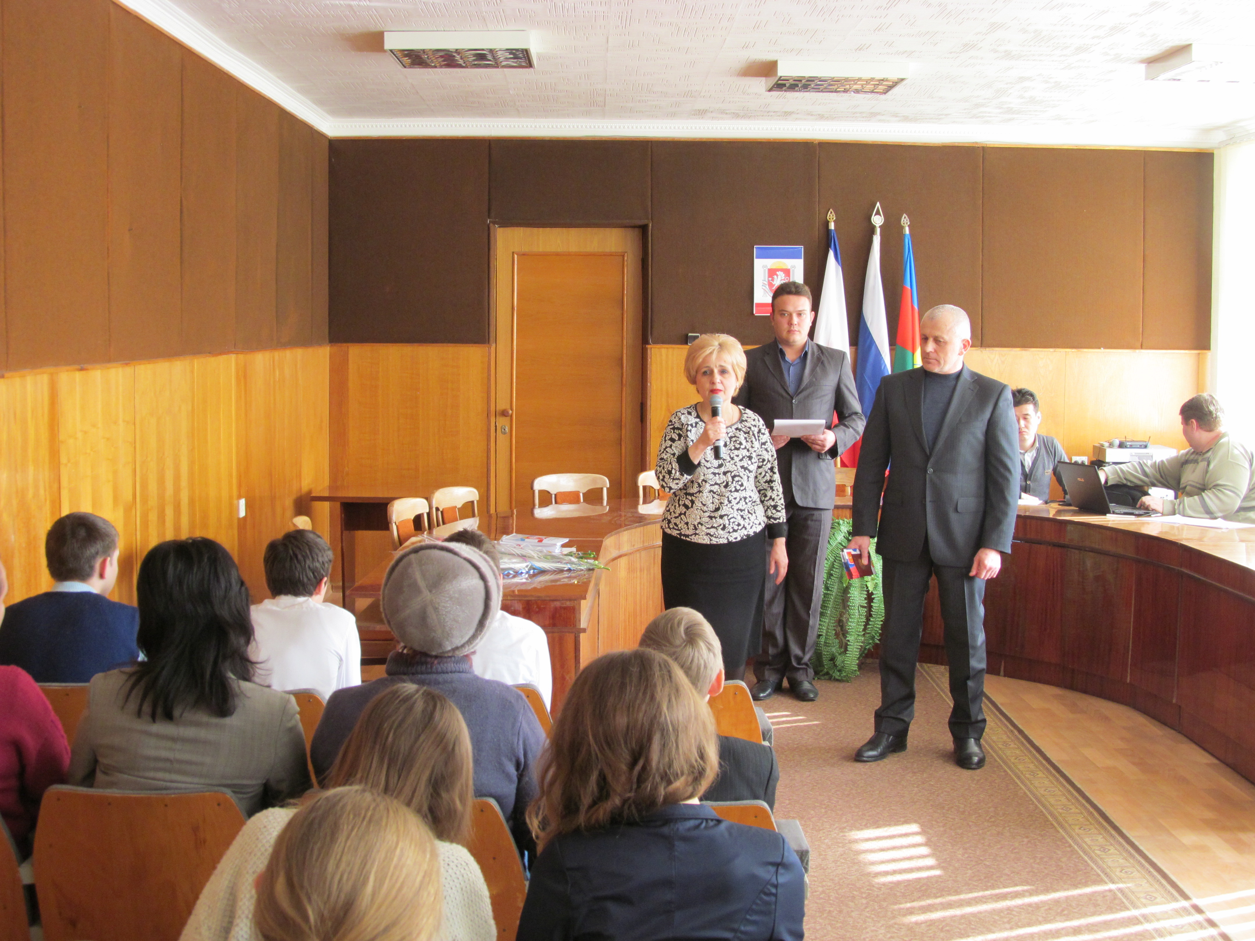 С приветственным словом перед собравшимися выступили: заместитель председателя Красноперекопского городского совета  Сусана Аджиева, заместитель главы администрации города Красноперекопска Дмитрий Онищенко, председатель территориальной избирательной комиссии города Красноперекопска Татьяна Мишина, начальник ТП УФМС по Республике Крым в Красноперекопском районе Сергей Стадник.  Все выступающие отметили, что став полноправными гражданами России, учащимся важно знать свои права и научиться ими пользоваться, стремиться быть активными, инициативными, развивать свои лидерские качества.