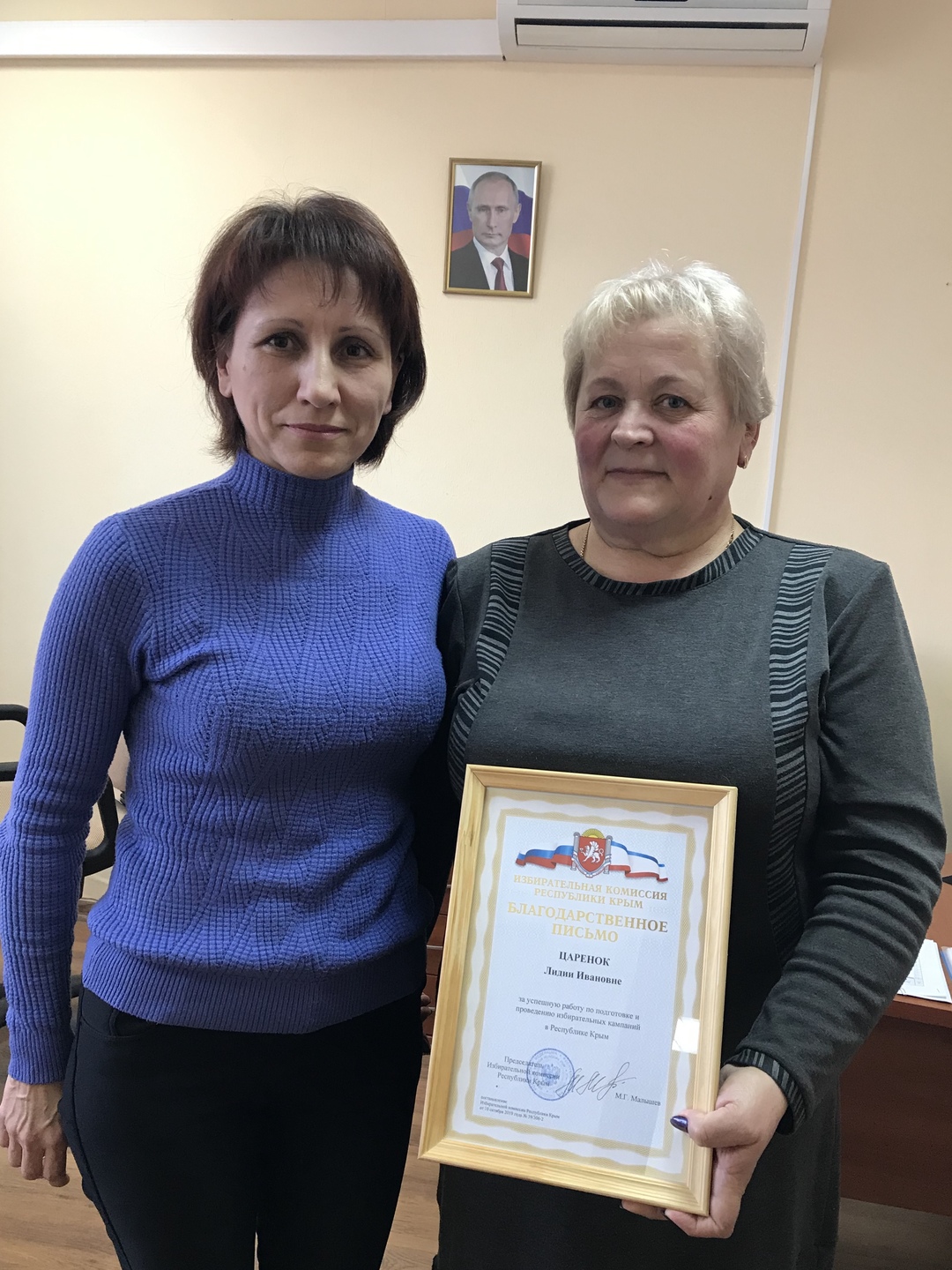 За активное содействие и существенную помощь в организации и проведении избирательных кампаний вручено Благодарственное письмо Избирательной комиссии Республики Крым Царенок Лидии Ивановне, члену территориальной избирательной комиссии города Красноперекопска с правом решающего голоса.